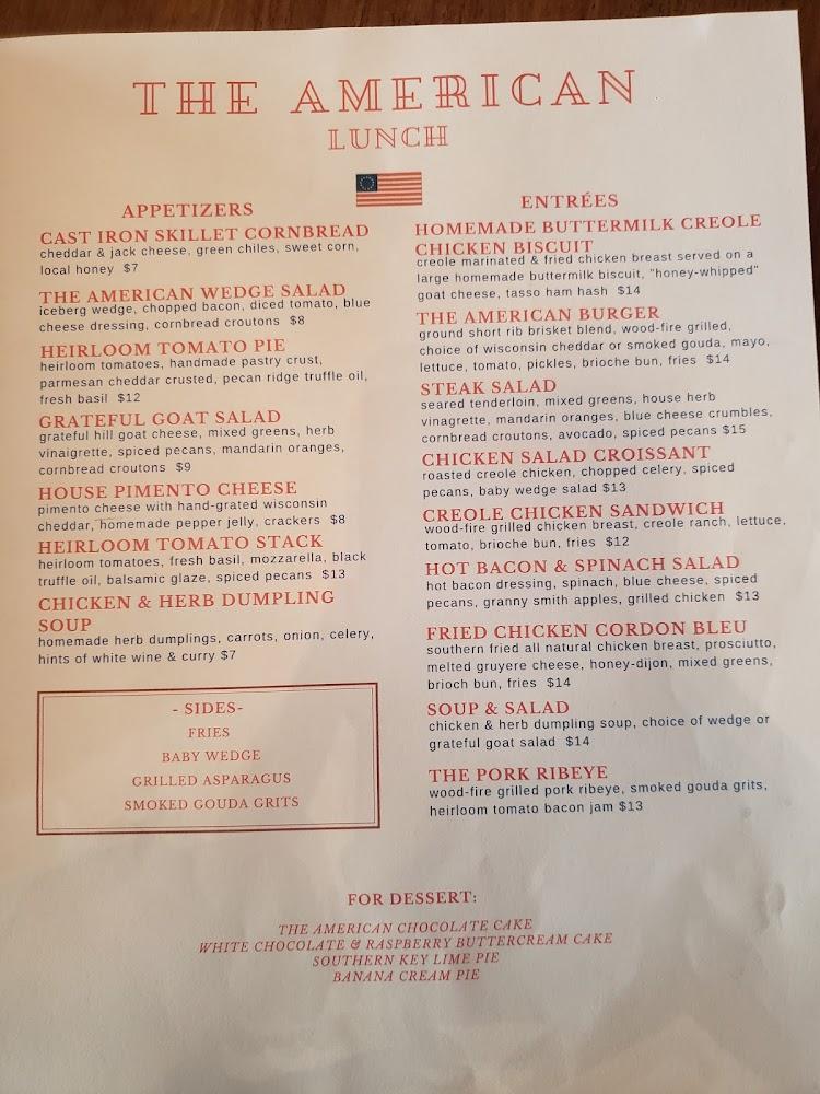 The American offers an extensive menu. It caters to a variety of tastes and dietary preferences. From appetizers like Sweet And Spicy Chicken Wings to entrées like Barrel Cut Filet, variety reigns supreme here. Local specialties and seasonal items frequently change, adding excitement to every visit.
