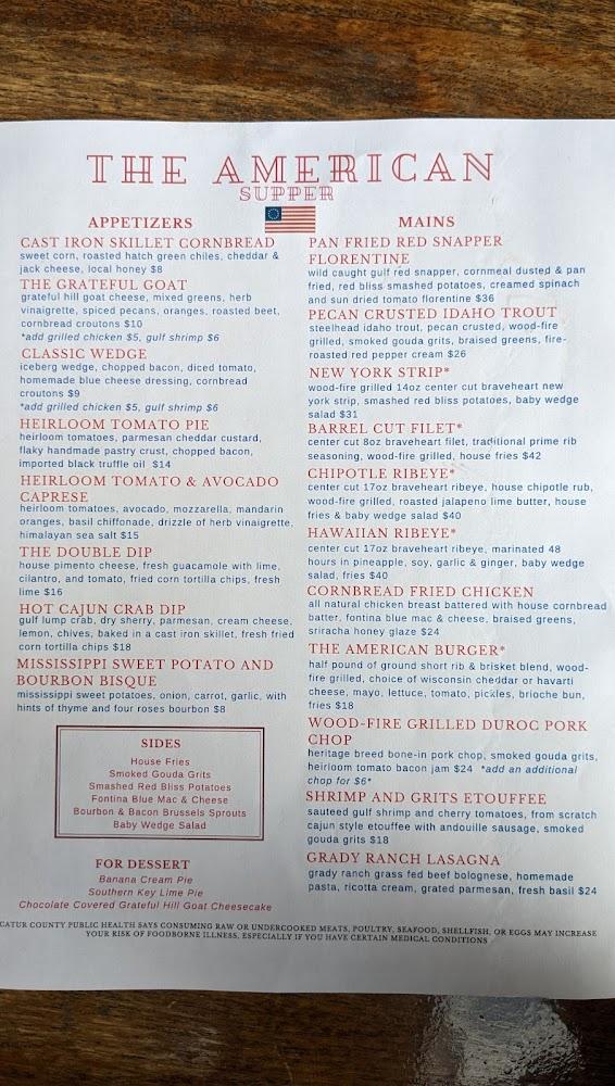 Welcome to The American, a vibrant gem located at 122 E Broughton St, Bainbridge, GA. Managed by a passionate woman, our restaurant offers a delightful blend of American cuisine and local specialties. Enjoy a relaxed atmosphere with outdoor seating, perfect for solo diners or families. Indulge in our excellent coffee, desserts, and an impressive selection of beers and wines. With convenient options for takeout and delivery, we cater to your dining preferences. Our welcoming space is accessible for all, making The American the go-to destination for lunch and dinner. Join us for a memorable culinary experience!